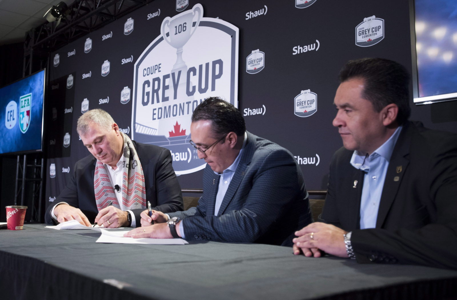 “It’s a historic day for the LFA because we are a young and growing league and our talent is here with a dream to play professional football in a big league like the CFL.” Commissioner Randy Ambrosie chatting with Fox Sports on site of the LFA Combine. Photo credit: CFL.ca Media at the LFA Combine in Mexico City. Photo credit: CFL.ca Commissioner Randy Ambrosie and Oscar Perez of the LFA signing a letter of intent in November. Photo credit: THE CANADIAN PRESS/Jonathan Hayward